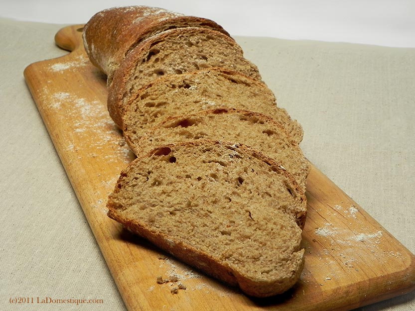 If you don’t have a baking stone, place a large flat cookie sheet in the oven and let it get hot. Using a razor blade, slice 2-3 diagonal slits in the top of each loaf. Slide the loaves into the oven using a floured baking peel and mist the inside of the oven with a spray bottle filled with water (just a few sprays). Bake the loaves for 5 minutes, then turn down the temperature to 425 degrees Fahrenheit and continue baking another 25 minutes. The finished loaves will have a rich, dark color and make a hollow sound when you tap on them. Remove the loaves from the oven and cool on a wire rack.