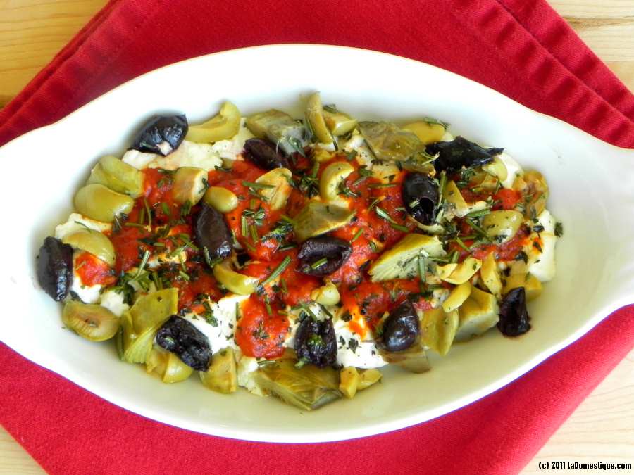 I’ve been to France, though not Provence, and one of my most enduring memories is the intense flavor of ripe, tart tomato paired with pungent oregano. Provencal cooking is all about bold flavors and taking advantage of the vegetable bounty throughout the seasons. It seems to me the hot, sunny Mediterranean climate means certain vegetables are ready for harvest all at once, and the locals must work with the glut of produce until it’s over and the next thing is ready: artichokes, asparagus, fava beans, etc. Olives and goat cheese are ubiquitous in Provence, and Patricia uses them as an introduction to her Provencal cooking. I mostly used her recipe as a guideline and followed her suggestion of flavors. Rather than buy 10 ounces of goat cheese for the gratin, I used a 4 ounce package to feed myself and the husband. I made the gratin with the casual abandon one exhibits when throwing ingredients on a pizza: