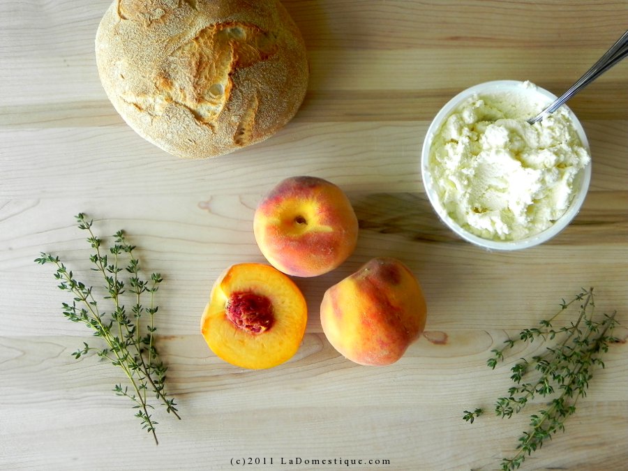 The second bruschetta focused on the beauty of savory thyme with sweet, juicy, summer peaches. I spread creamy ricotta cheese over the grilled bread, then topped it with sliced peaches and thyme leaves. Heaven!