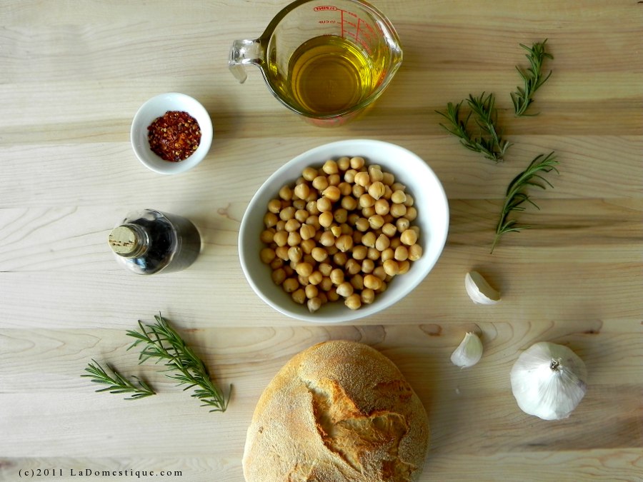 The last bruschetta was inspired by a recipe from Mario Batali’s Babbo Cookbook, Ceci Bruschetta. Ceci is Italian for garbanzo beans (chickpeas). I simplified the recipe in Babbo, choosing to focus on rosemary as the star. The can of garbanzos was tossed with olive oil, balsamic vinegar, red pepper flakes, garlic, and chopped rosemary; then served over the grilled bread. Balsamic and rosemary are fantastic together, and the garbanzos make for a satisfying antipasto.