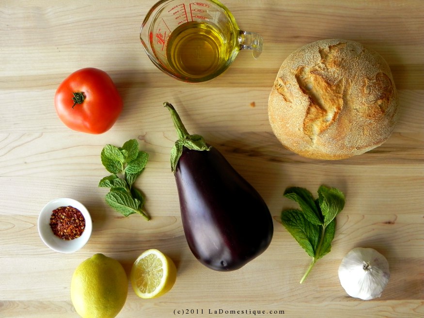 For the toppings, I thought carefully about perfect pairings- the magic that occurs when two ingredients compliment each other in such a way that the flavor is imprinted on your memory. Eggplant, which is in season right now and it’s great for bruschetta, either grilled and served in chunks or puréed like hummus. I chose mint and crushed red chili pepper to flavor the eggplant bruschetta. The combination may seem strange- refreshing mint with hot pepper? Hot mint oil, a traditional Persian recipe, is made with these ingredients and used as a condiment in the Middle East. I simply sliced an eggplant into round discs and threw the discs onto a hot grill, no oil or seasoning (just like the ladies at London River Cafe do in Italian Two Easy). After a couple of minutes, once the eggplant was charred, I turned it over to cook the other side for a couple minutes more. Then I removed the eggplant from the grill and tossed it in lemon juice, olive oil, chopped mint and crushed red pepper flakes. To serve the bruschetta, place the eggplant discs atop the toasted bread and drizzle with olive oil.