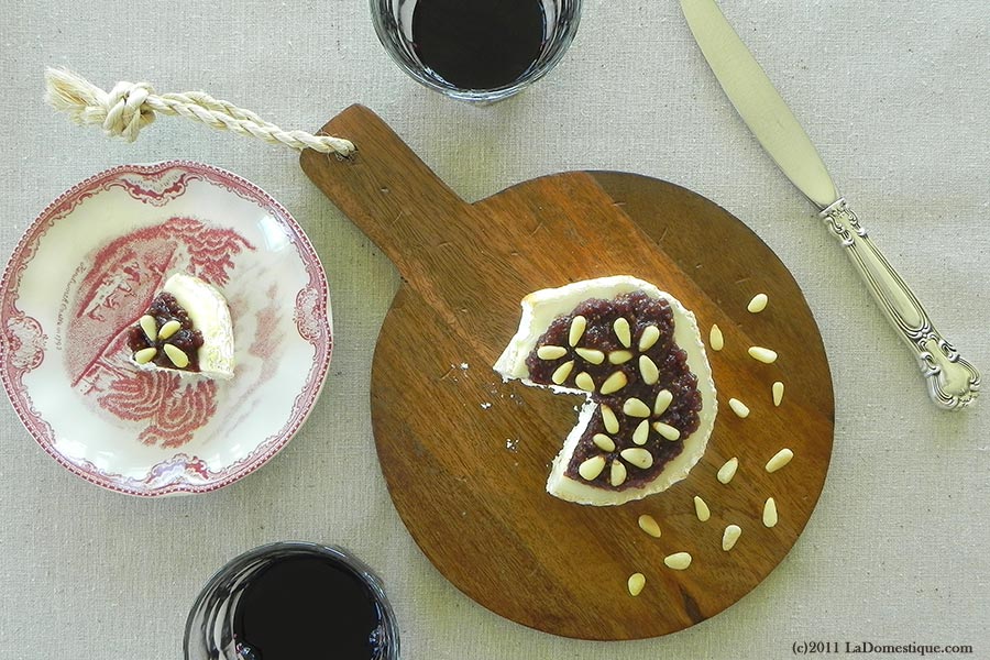 An hour before you plan to serve the cheese, take it out of the fridge to come to room temperature. The fig purée can be made the night before, just make sure you serve it at room temperature as well. To make the fig purée: bring water to a boil in a small pot. The amount of water you use will determine the thickness of the purée. My ratio was 1 cup of water to 1 cup of dried figs. Remove the pot from the heat and add the figs. Soak them for about 10 minutes, then purée the entire mixture using a food processor or handheld immersion blender. Spoon the fig purée into a jar until you are ready to use it. Toast the pine nuts in a skillet over medium-low heat until golden brown and fragrant, about 5 minutes. To serve the cheese: Place the cheese on a platter and spoon the fig purée atop. Sprinkle the pine nuts over. This cheese plate is delicious with red wine or Port.