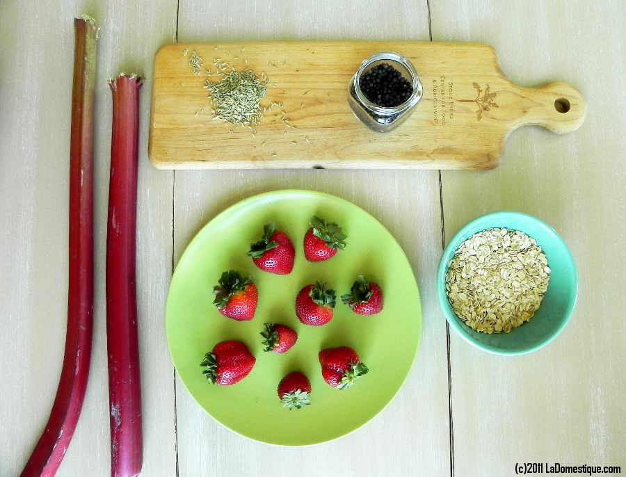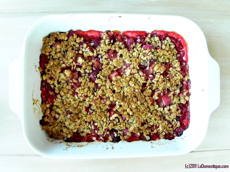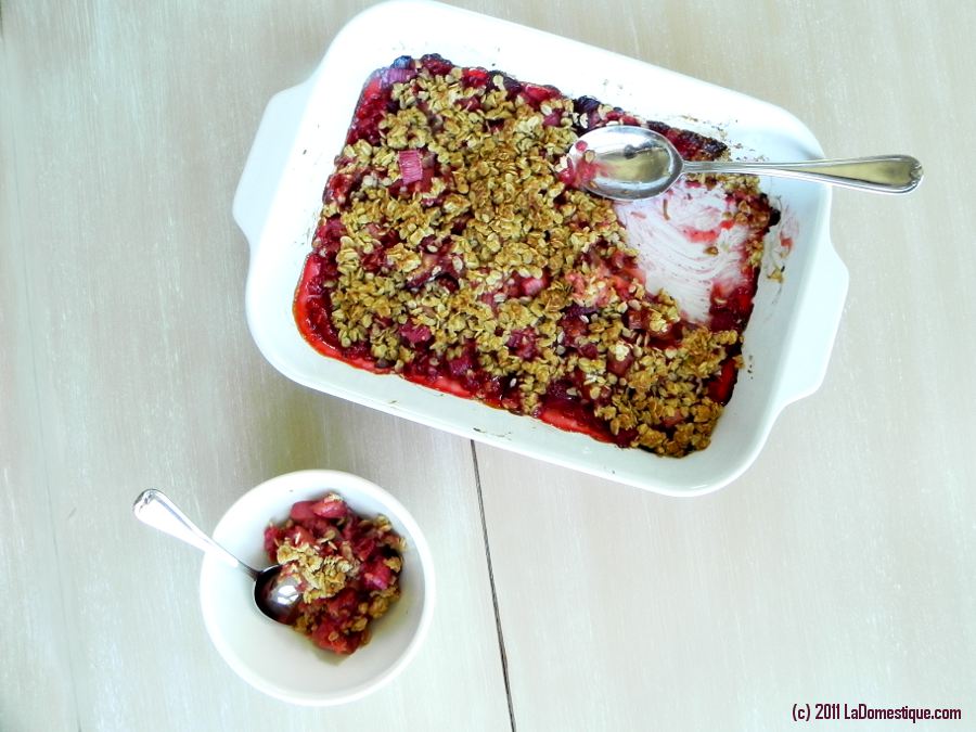 I’m so excited about this recipe I can hardly stand it! Originally inspired by the the article, “Come Together” in the June issue of Whole Living magazine, I have gone down a different road. This week at La Domestique, I’m cooking with oats, which are essential to the topping of a traditional crisp. Have you ever made a crisp before? You should! Crisps are simple to bake yet make you weak in the knees yummy. Comforting oozing hot fruit topped with a golden, lightly crunchy crust- that’s a crisp. Interpret it in your own way. Try a combination you imagined in your mind. Crisps are a great way to try new things and come out successful. What can go wrong? Hot fruit, crispy topping, done. Easy peasy.
