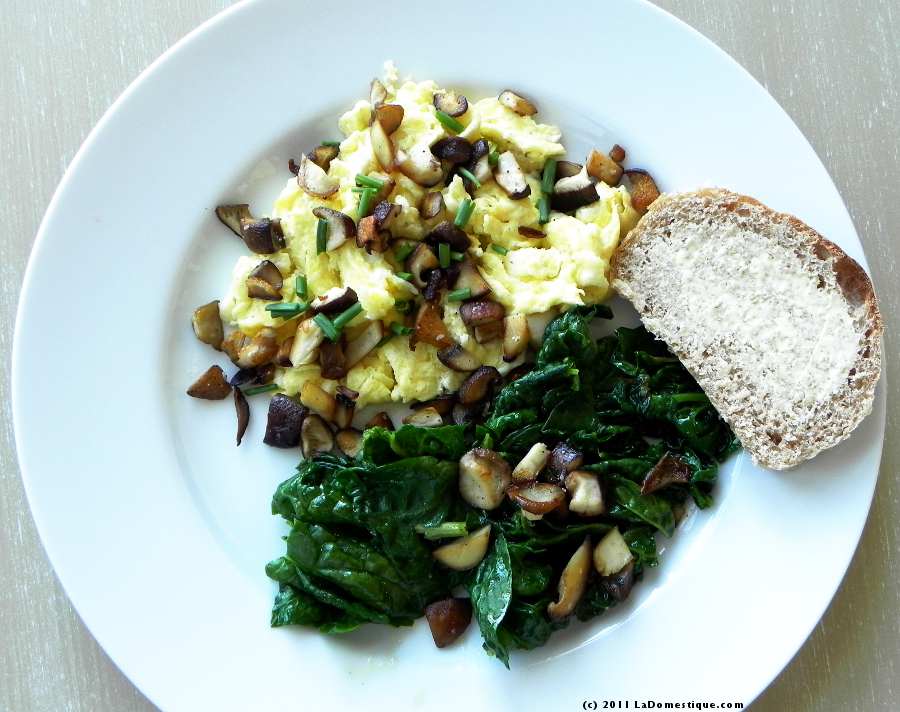 To begin, heat a medium non-stick skillet over low heat and toss in a generous tablespoon of butter.  Once the butter has melted, add the minced shallot and cook for 1 minute. Stir the mushrooms in with the shallot and cook  over medium heat for a few minutes, until the mushrooms are tender and lightly browned. Remove the mushroom-shallot mixture from the pan** and toss in a tablespoon of butter for cooking the eggs. Once the butter has melted and begun to foam, gently whisk the eggs and pour them into the pan. Cook over medium-low heat, stirring constantly, until the eggs have come together in creamy, soft curds. The eggs will be about 90% done at this point. Don’t worry, the eggs will continue to cook on the plate. Sprinkle with salt and pepper.  Serve the sautéed mushrooms atop the scrambled eggs topped with snips of fresh chives. Market spinach sautéed in garlic and olive oil is a nice accompaniment.