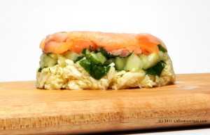Now it’s time to assemble the terrine.  I split the ingredients equally to between two 6 ounce ramekins lined with plastic wrap. First I pressed in a layer of smoked salmon, then I sprinkled in parsley, dill, and chive. Next I pressed in the cucumber followed by a sprinkling of mint and ending with the crab meat. I wrapped the plastic over the crab meat base and weighed the terrine down with a soda can. After chilling for one hour, the terrine may be removed from its mold and served to your friends with some tasty crackers.