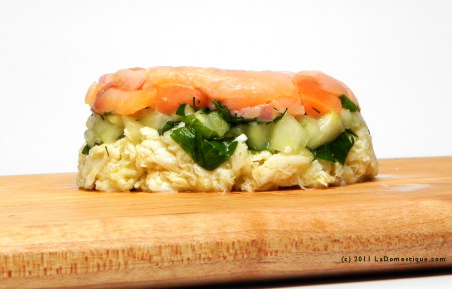 The inspiration for my happy hour menu was a recipe for “Crab & Smoked Salmon Terrine” from Stéphane Reynaud’s book, Terrine. I love the concept of a terrine: the layers of color and flavor, combination of textures, and the delight of unmolding something you’ve worked so carefully on- hoping it’s going to come out right. A terrine is meant to be shared with others, and serving one at the cocktail hour brings a spirit of conviviality to the occasion. Everyone will “ooh” and “ahhh” over your delicate handiwork, and you will feel right proud of yourself.