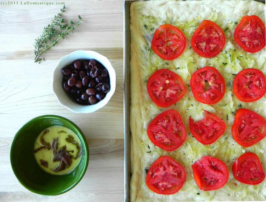 Though both authors suggested using a variety of herbs to flavor the Pissaladière, I felt very strongly about using only thyme. A year ago, the husband and I traveled through France. That is where I first tasted Pissaladière, and I can’t forget the savory flavor of thyme with the tomatoes and olives. Anchovies are also essential. The heat of the oven transforms their salty, fishiness into a rich, umami flavor. If you’ve never tasted Pissaladière, it’s time to try something new. Making it was so simple and straightforward, I’m kicking myself for waiting so long to give Pissaladière a go. This French pizza is my new favorite for an easy supper. Enjoy your weekend, and give Pissaladière a try!