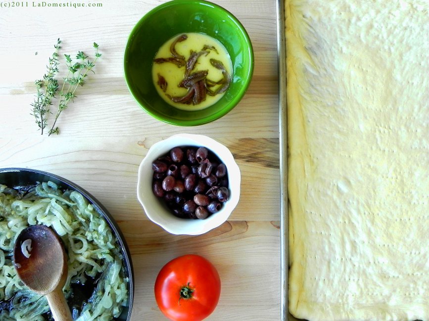 Preheat the oven to 450 degrees fahrenheit. Soak the anchovies in milk. Heat the 1/4 cup olive oil in a large sautée pan over medium heat. Add the garlic, onions, and salt. Sweat the onions until very soft, about 20 to 30 minutes. Keep an eye on the heat. Do not allow the onions to caramelize. Toss in 1 tablespoon of thyme and remove the onions from the heat.
