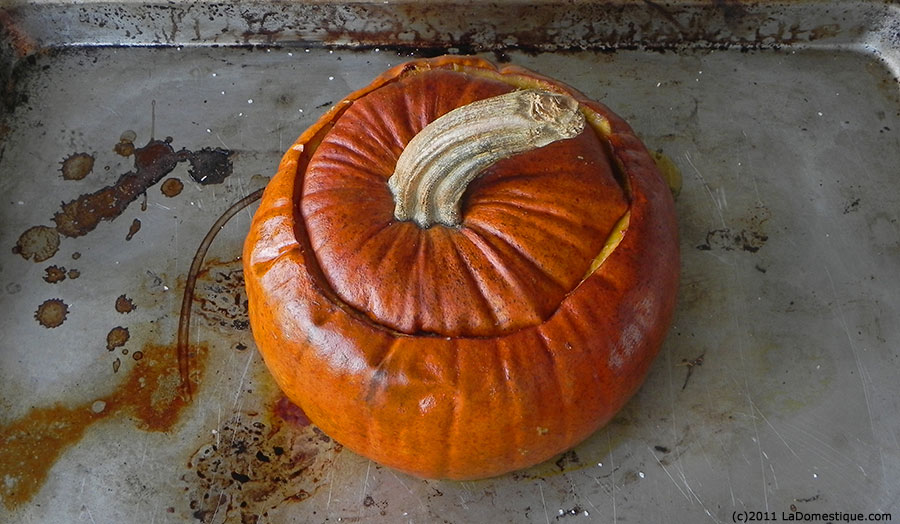 Cut the top off the pumpkin and set aside, you will use this as a lid during baking. Hollow out the pumpkin by removing the seeds and scraping the sides completely clean. Put the pumpkin on a baking sheet with sides (in case leaking occurs during baking). Rub the pumpkin down inside and out with a little olive oil. Season the inside with salt.