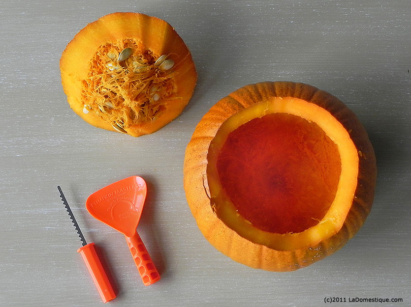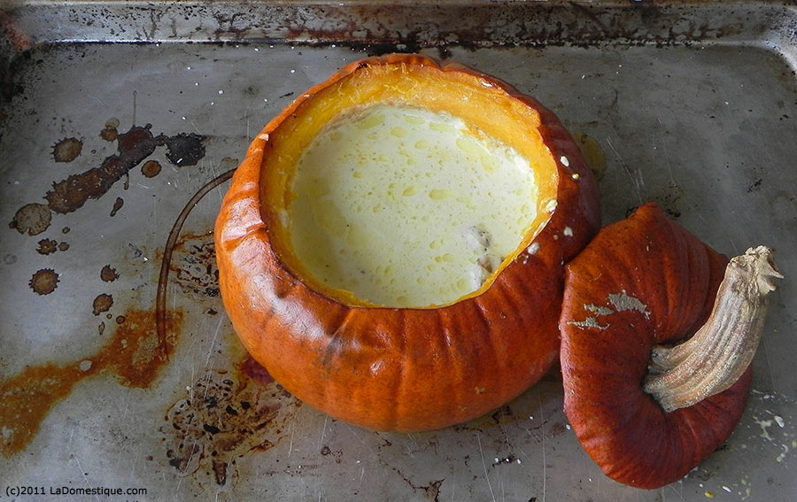 Cook the pumpkin in the preheated oven for 45 minutes to an hour and fifteen minutes, depending on its size. The pumpkin is ready when it begins to sag a bit and the skin turns a darker orangey-brown. Check to make sure the inside flesh is tender by removing the lid and checking it with a knife. Transfer the pumpkin to a bowl and cut into slices, allowing the soup to fill the bowl. Serve the pumpkin slices individually in bowls with plenty of creamy soup ladled over.