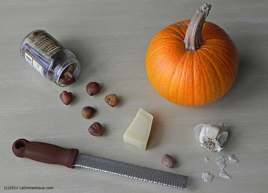 At the market I picked up one of the last of the local pie pumpkins. A few of his friends were a bit soft and beginning to turn. Knocking on the hard orange flesh I could hear the hollow sound that let me know he was a good one. Still firm and fresh and eager to be cooked. I brought him home with a jar of roasted chestnuts and a tiny nugget of Gruyère. I had soup on my mind.
