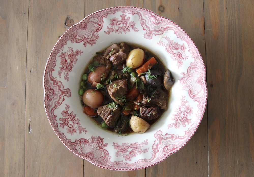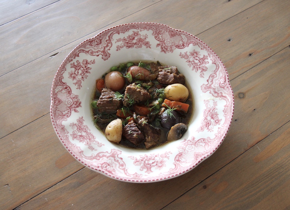 I’ve been craving beef stew, but not a heavy stick to your bones winter stew. I wanted something comforting but still light, fresh, and nourishing. As I imagined what would qualify as a spring beef stew a few flavors came to mind: fresh dill, mushrooms, leeks, bacon, and peas. While grocery shopping I was delighted to come across some baby potatoes in red, purple, and gold. The goal was a light and clear broth, as opposed to the thick sauce of a winter stew. I wasn’t even planning a blog post but the dish turned out so beautifully I had to quickly snap a couple of photos and share this slap-dash recipe.