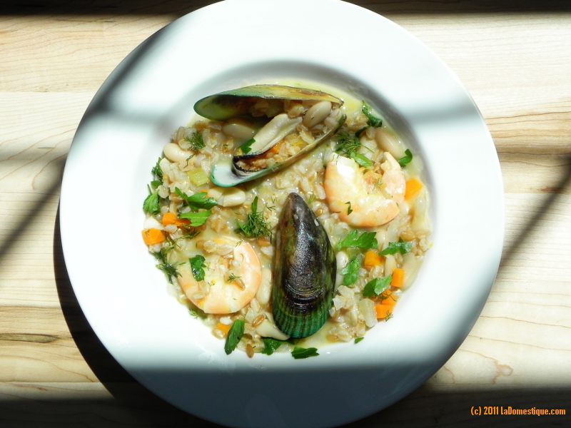 The Vernaccia grape is used to produce lighter white wines with crisp acidity, floral aromas, and a bitter finish. At my local wine shop I picked up a bottle of 2009 Fontaleoni Vernaccia di San Gimignano for $13. This wine is light and zesty with an intense acidity and a peppery finish. I did get the characteristic hint of bitter almond as well. I paired Fontaleoni Vernaccia di San Gimignano with my own recipe for Spring Seafood Stew with Farro. The flavor in this recipe relies heavily on the liquor from beautiful Green Lipped Mussels of New Zealand. These sustainable mussels are large, meaty and have a sweet taste of the ocean. The sweet, nutty farro pairs nicely with orange, lemon, and white wine. Herbal flavors of anise and dill are a reminder that spring is here. A splash of cream at the end balances the acidity of the dish and the wine. This recipe is broken down into two phases: cooking the farro, and cooking the seafood. In the end everything is combined into one light but nourishing stew.