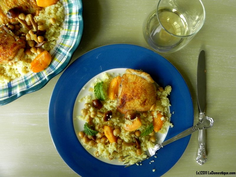 Mound the couscous onto a big platter. Place the chicken atop the couscous. Now, you want to separate the broth from the mushroom/apricot/chickpea mixture. {Couscous is very absorbent, so it’s best to pass the broth in a gravy boat at the table for everyone to enjoy. If you pour the broth over the couscous now, it will absorb entirely in just a couple of minutes.} Spoon out the mushrooms, apricots, and chickpeas and arrange them on the platter with the chicken. Pour the broth into a gravy boat and put it on the dinner table. Garnish the platter of chicken and couscous with fresh mint leaves and almonds. Serve the platter at the table, allowing everyone to help themselves and pass the gravy around.